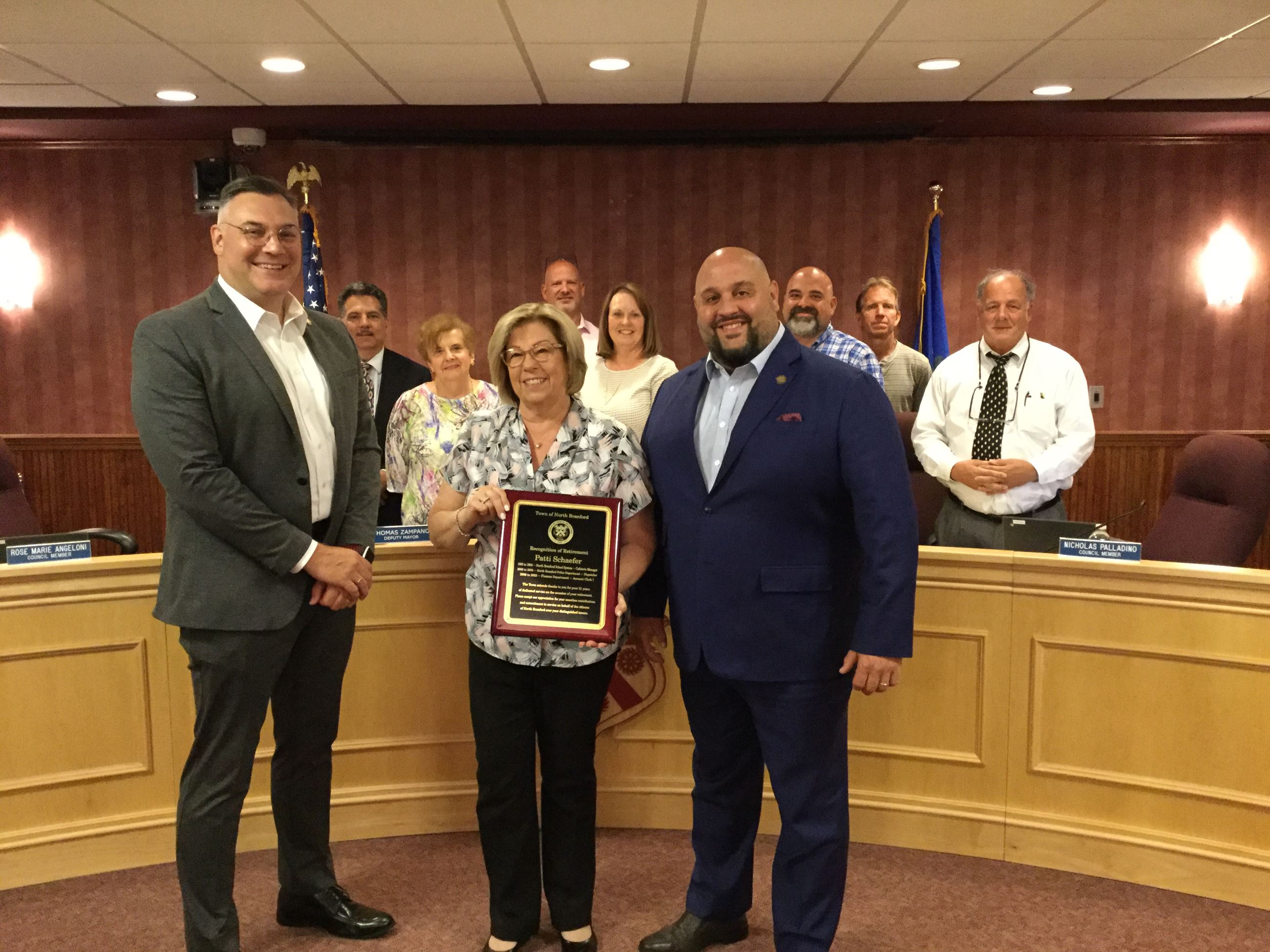 NORTH BRANFORD – Town Manager Michael Downes and the North Branford Town Council recognized the service of Patti Schaefer to the Town at their August 1st meeting. Schafer was presented a plaque honoring her for her dedicated service of 31 years upon the occasion of her retirement.